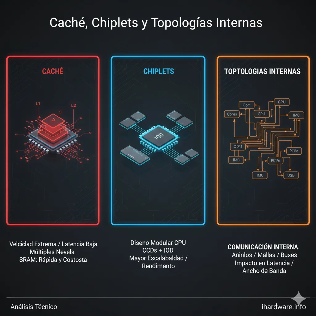 Caché Chiplets y Topologías Internas. La jerarquía de caché y la topología interna de un procesador determinan gran parte del rendimiento real, especialmente en cargas sensibles a latencia y en escenarios multi‑hilo. En arquitecturas modernas, conceptos como chiplets, CCD y NUMA introducen beneficios de escalabilidad, pero también nuevos cuellos de botella invisibles para el usuario.